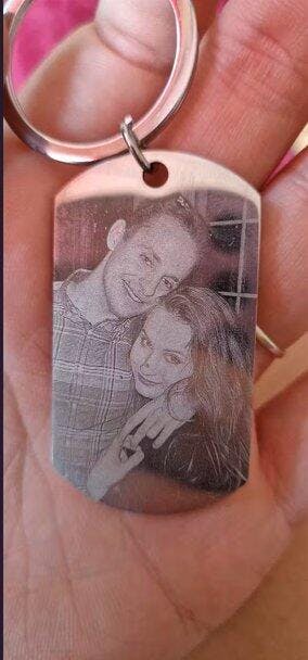 Mūsų personalizuotas raktų pakabukas su šuns žetonu leidžia išgraviruoti nuotrauką priekinėje pusėje ir pridėti savo tekstą ar simbolį galinėje pusėje. Puikiai tinka kaip dovana jam ar jai – vaikinui, tėčiui, draugui – arba kaip prasmingas ženklas sau.